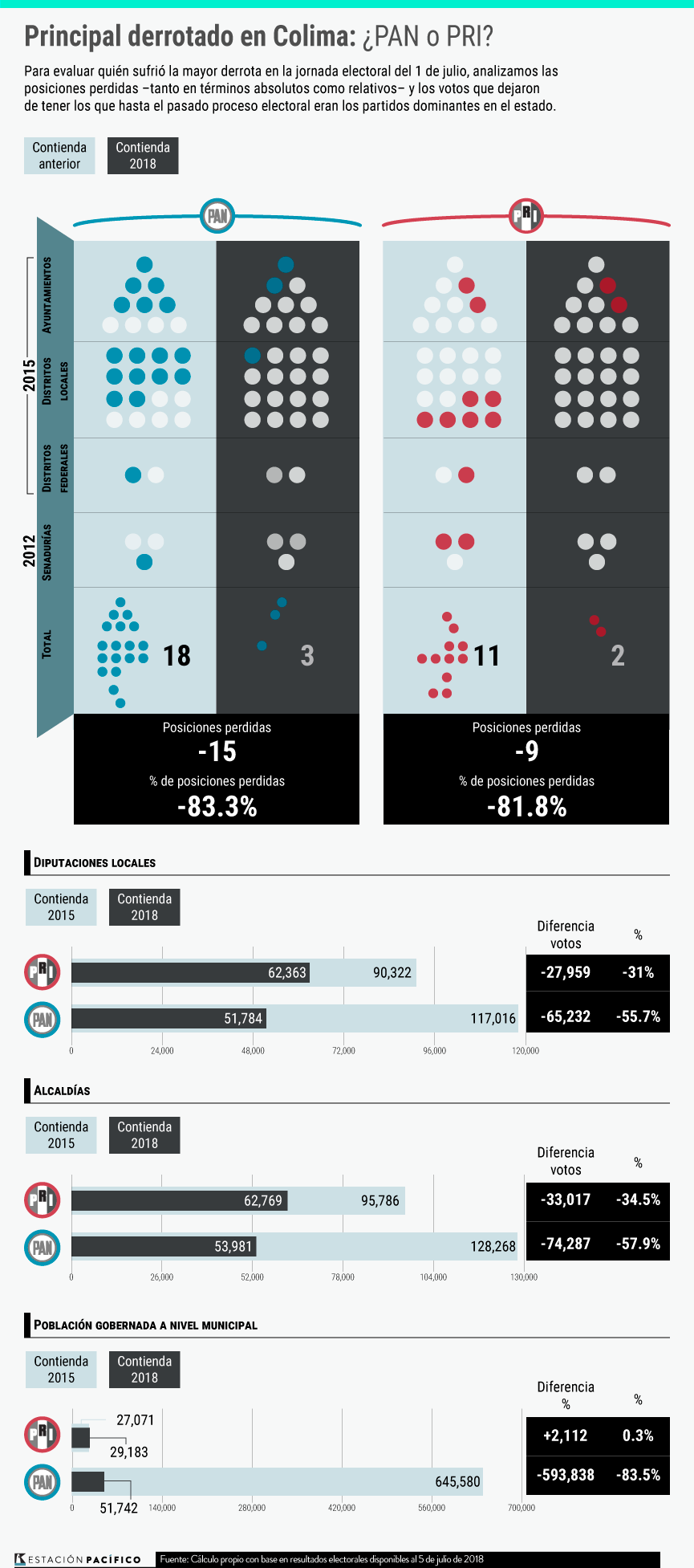 El PRI —el partido en el gobierno— perdió posiciones en el Senado, una diputación federal y las diputaciones de mayoría en el Congreso local, donde solo tendrá representación con diputados plurinominales. El PAN —que dejará de ser la principal fuerza opositora— también perdió sus posiciones en el Congreso federal, su posición predominante en el Legislativo local —donde apenas ganaron un distrito de mayoría y contarán con menos de representación proporcional— y esta vez no les alcanzó para ganar los municipios más poblados: Manzanillo, Colima capital, Villa de Álvarez y Tecomán.