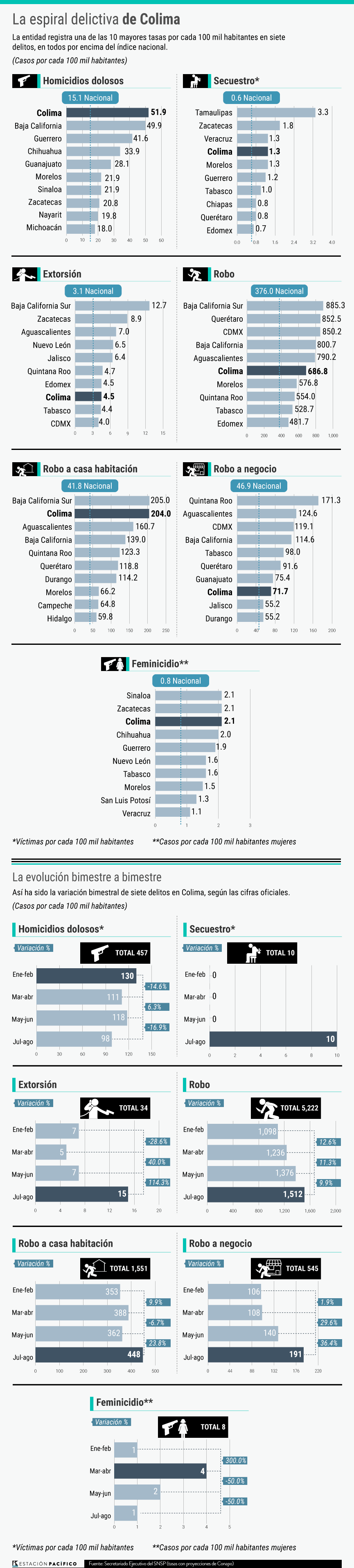Colima acumula la mayor tasa de homicidios dolosos en el país, con 51.9 víctimas por cada 100 mil habitantes en lo que va del año, aunque entre julio y agosto registró la menor incidencia de este delito en lo que va del año. Los 204 casos de robo a casa habitación y las 2.1 víctimas de feminicidio por cada 100 mil mujeres también colocan a la entidad en el podio de estos delitos.