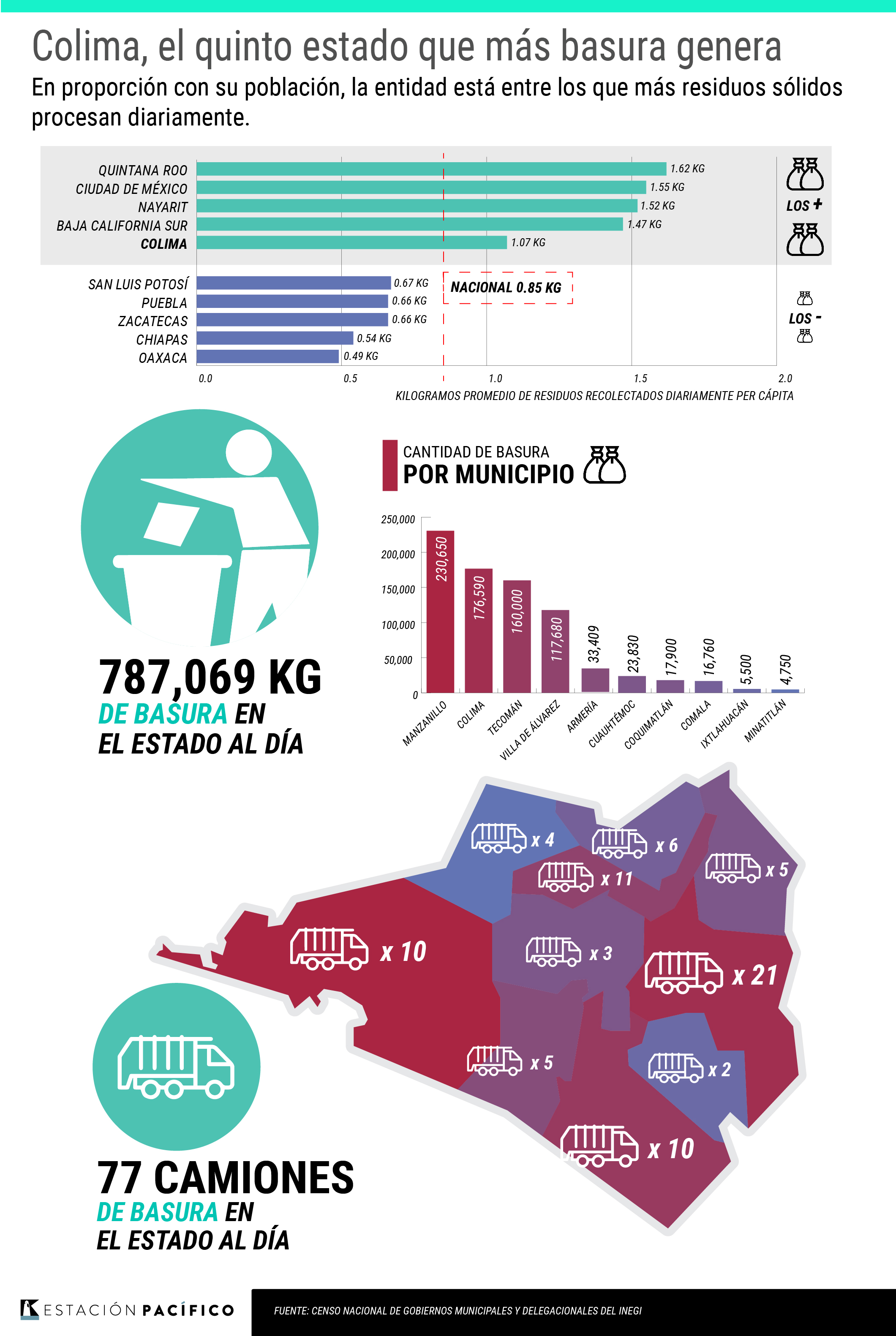 Según las cifras del Inegi, el municipio que más basura genera por día es Manzanillo, con 230 mil 650 kilogramos; le sigue la capital colimense, con 176 mil 590 kilos de desperdicios cada día. En tercer puesto, se encuentra Tecomán con una producción diaria de 160 kilos de desperdicios sólidos.