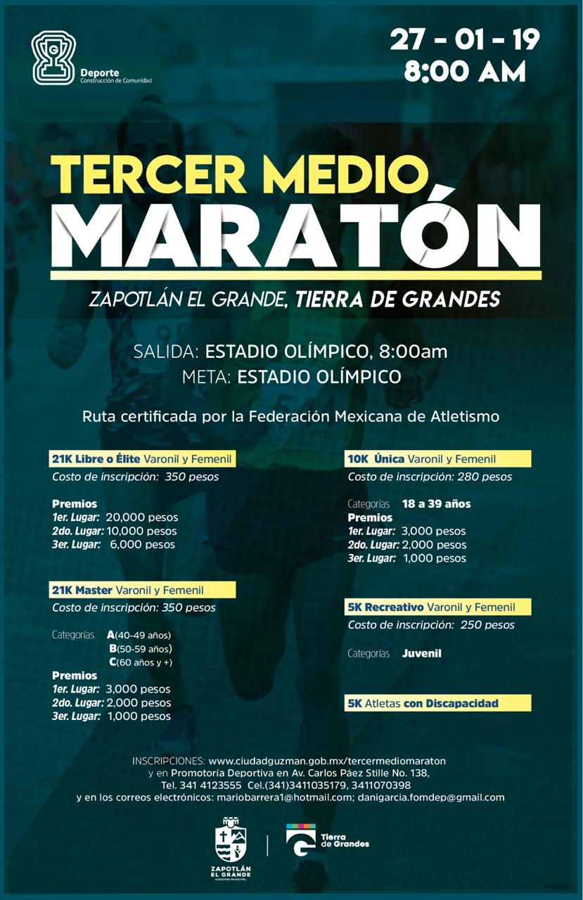 El Ayuntamiento de Colima, en coordinación con Zapotlán El Grande (Ciudad Guzmán), convocaron al medio maratón que tendrá lugar el 27 de enero a las 8 am en el Estadio Olímpico de ese municipio jalisciense.