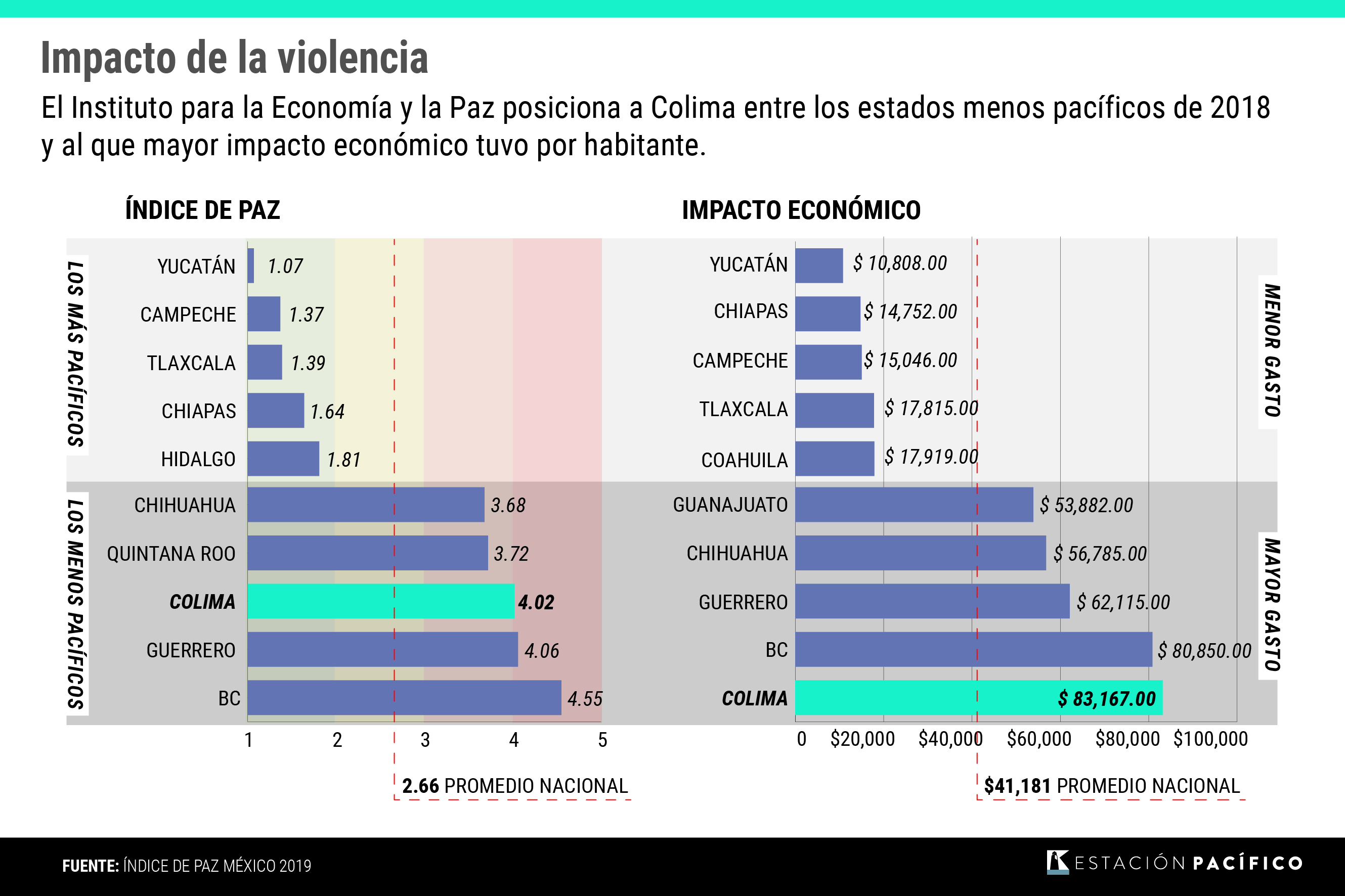 La violencia le costó a la entidad 73 mil 500 millones de pesos en 2018, lo que representa 83 mil 167 pesos a cada habitante, de acuerdo con el Índice de Paz. Esto posicionó a Colima con el mayor impacto económico per cápita.