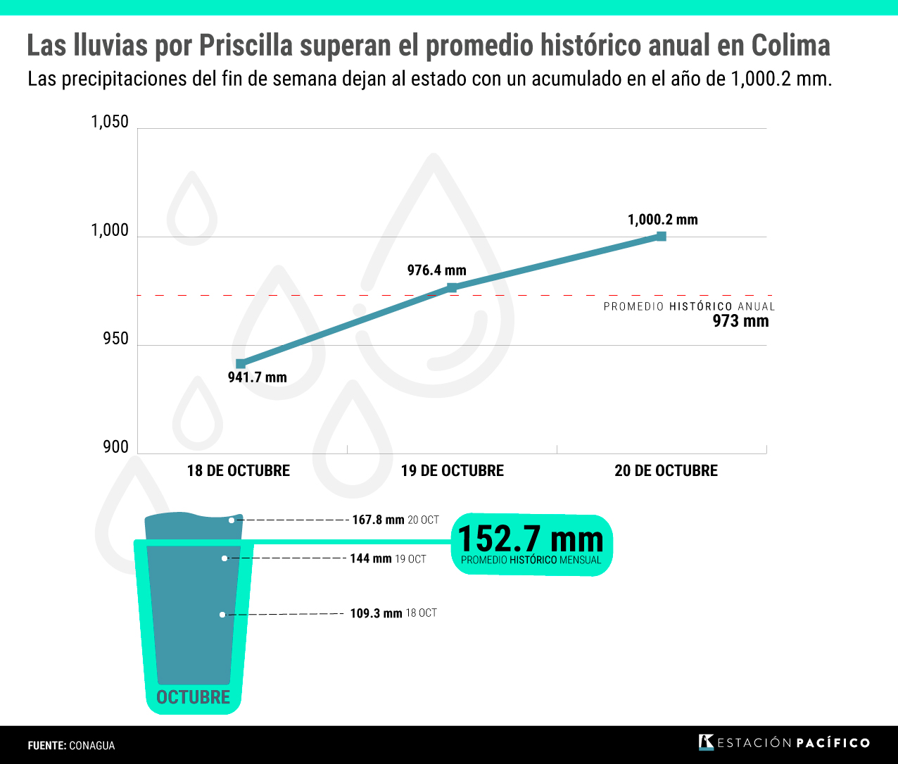Colima superó el promedio histórico anual en precipitaciones (973 milímetros) con las lluvias que la tormenta tropical Priscilla ocasionó el fin de semana, cuando según la información de la Comisión Nacional del Agua (Conagua) se superaron los 1,000 mm.