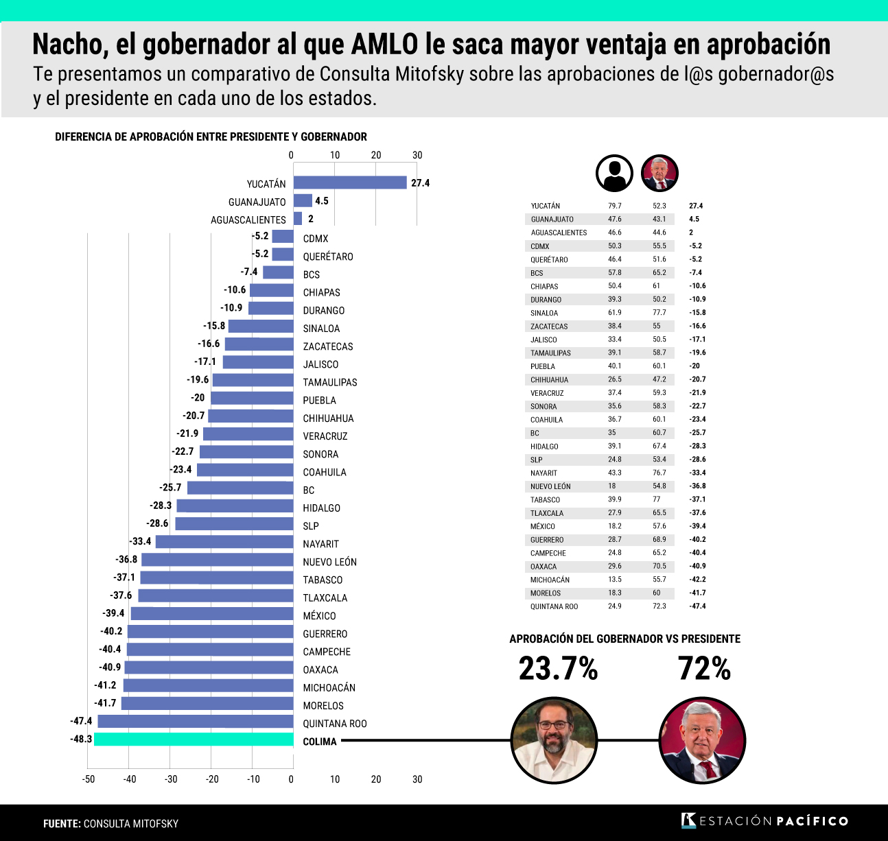 De acuerdo con un estudio reciente de Consulta Mitofsky, en Colima el 72% de los encuestados aprueba la gestión del presidente López Obrador, mientras que el 23.7% avala la labor del gobernador, para un diferencial de -48.3 puntos porcentuales, el cual es el mayor del país.