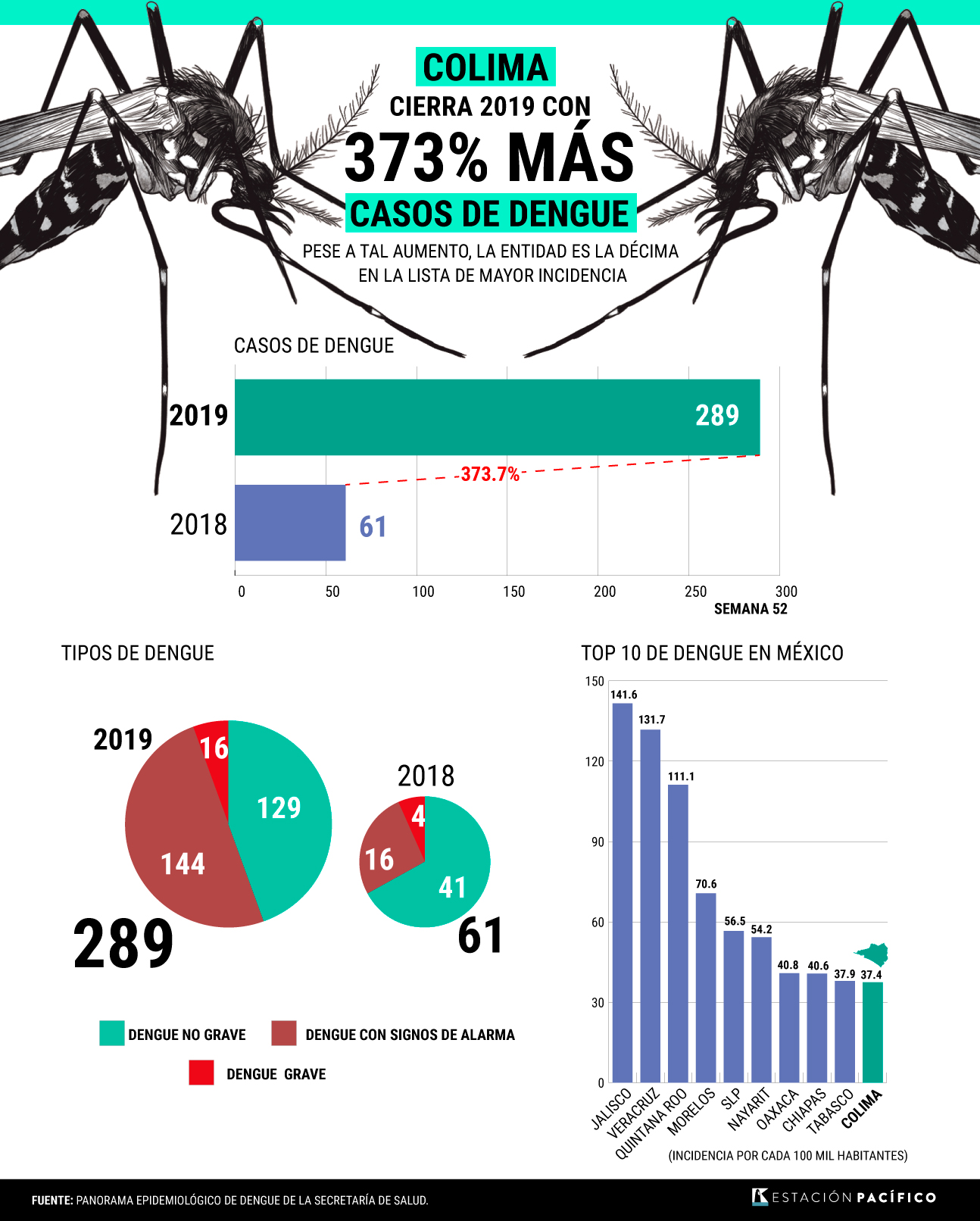 Durante el 2019 Colima registró 289 casos de dengue, cifra que representa un incremento de 373% en la incidencia del 2018, cuando se reportaron 61 casos, de acuerdo con la actualización más reciente del Panorama Epidemiológico de Dengue de la Secretaría de Salud del Gobierno de México, con corte al 30 de diciembre.