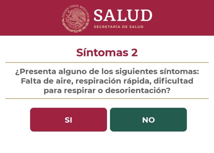 Después de completar el formulario, la aplicación preguntará si presentas falta de aire, respiración rápida, dificultad para respirar o desorientación.
