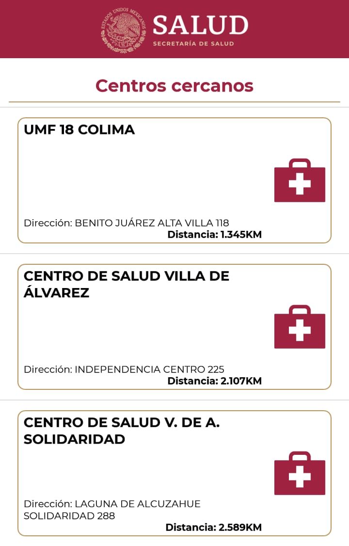 Al descargar la aplicación, se solicita acceder a la ubicación del usuario, lo cual servirá para detectar los centros de atención médica más cercanos a los que puede asistir la persona. Muestra la dirección y distancia aproximada de cada hospital.