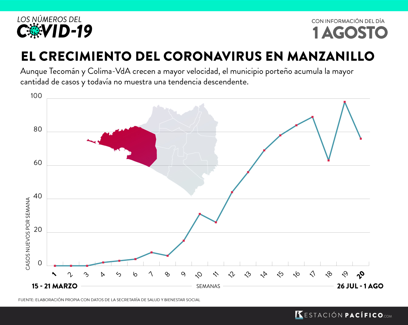 Manzanillo continúa siendo el municipio con más casos positivos acumulados y muertes contabilizadas del estado, con 752 personas contagiadas y 112 fallecimientos hasta el 1 de agosto.