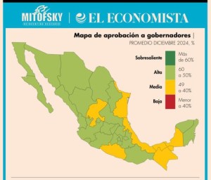 A nivel nacional, la aprobación promedio de las y los gobernadores del país es de 51.2% y cayó 0.6 puntos porcentuales de la medición de noviembre de 2024 a la de diciembre de 2024.