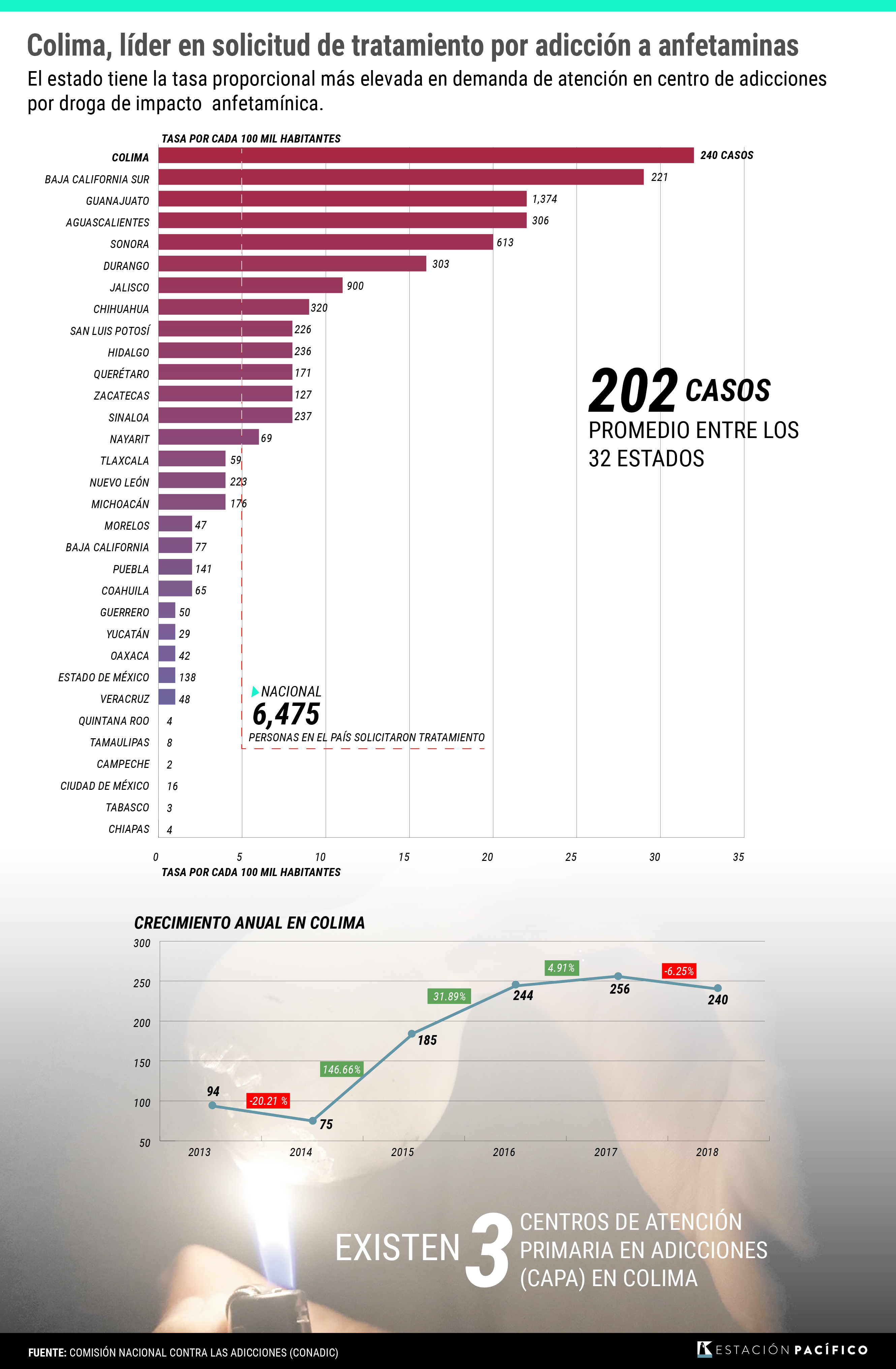 También así lo refrendan las cifras del Observatorio Mexicano de Drogas, que arrojan que el consumo de estimulantes del tipo anfetamínico es el que más demanda de tratamiento causa en el estado con 240 solicitudes durante 2018. Colima tiene una tasa de 32 casos por cada 100 mil habitantes, la mayor del país, en tanto que el indicador nacional es de apenas 5.